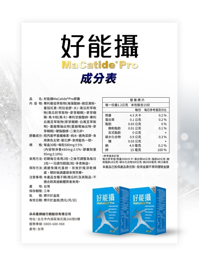 內容物名稱好好聊日子 好能攝MaCatidePro膠囊(30粒/盒)