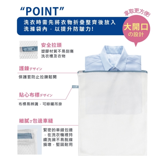 使用方法洗衣前請先將衣物分類依據衣物的大小選擇洗衣袋的尺寸。 ( 請勿選擇過大洗衣袋以免清洗時堆積於袋角 ) 將衣物內面朝外折疊整齊後平放置入洗衣袋。( 如衣物過於髒污需先沖洗 ) 拉上拉鍊後將拉鍊頭置入保護套內即可放入洗衣機。 洗衣袋使用完畢後也需通風陰乾以保持洗衣袋衛生。 建議放置1-2枚衣物於洗衣袋清洗可達最佳洗淨力。