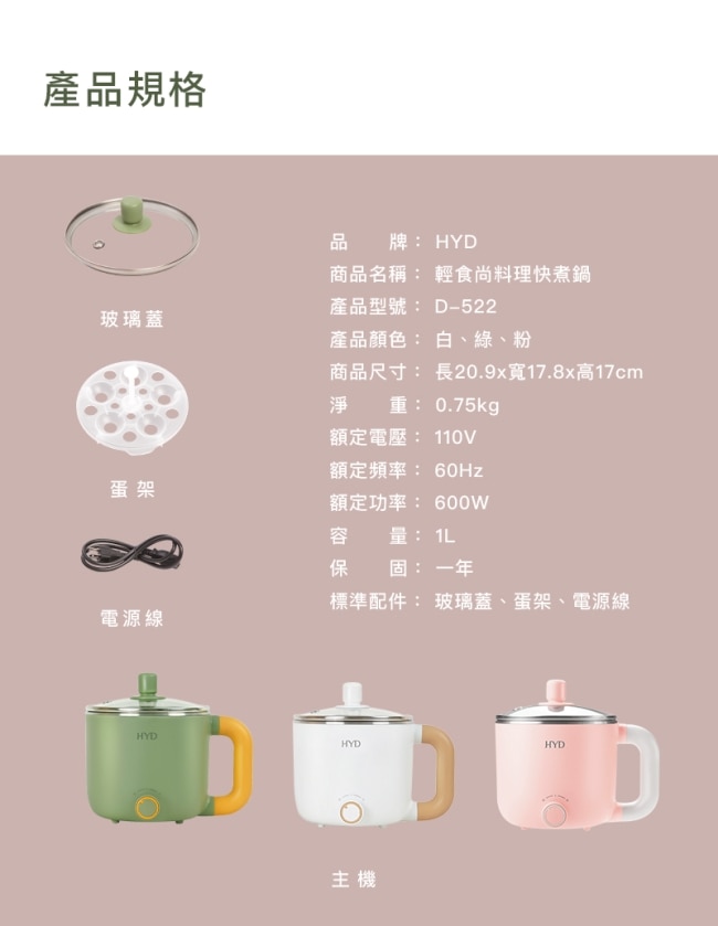 | 商品簡述 | HYD 輕食尚料理快煮鍋(附蒸蛋架) D-522-粉 |