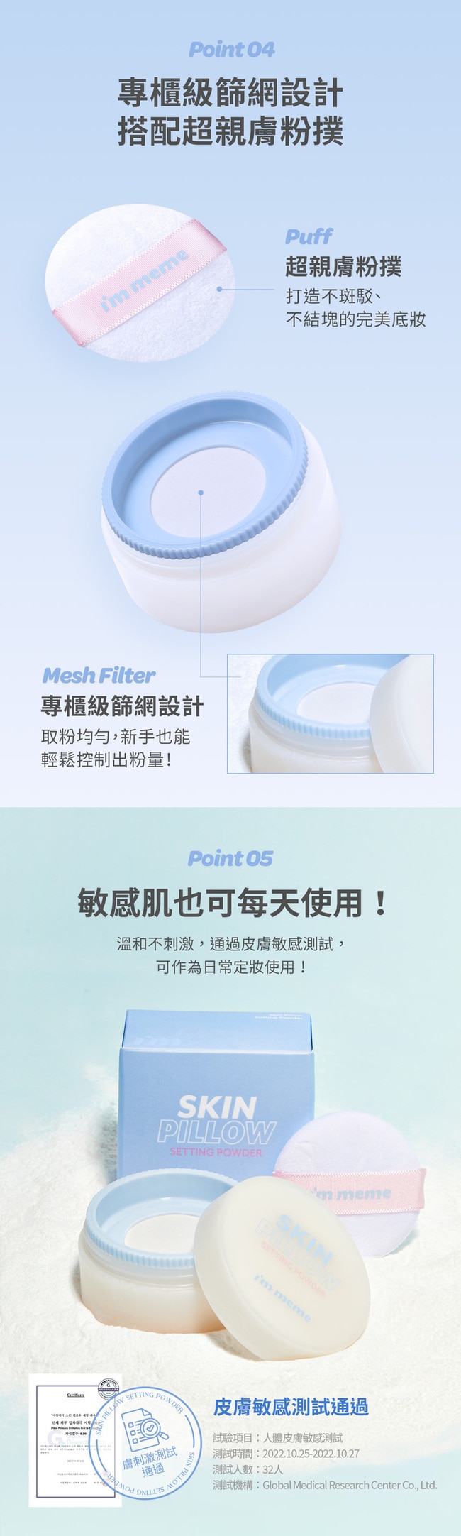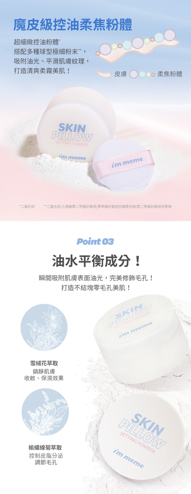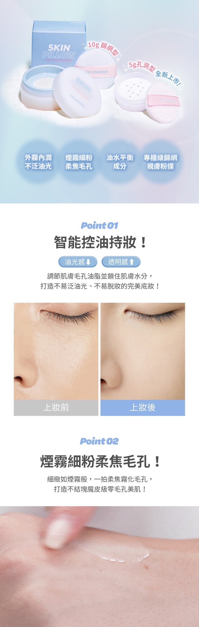 | 商品簡述 | 1.奈米級細緻粉體完美柔焦毛孔! 2.外霧內潤,控油持妝! 3.篩網設計x超親膚粉撲! |