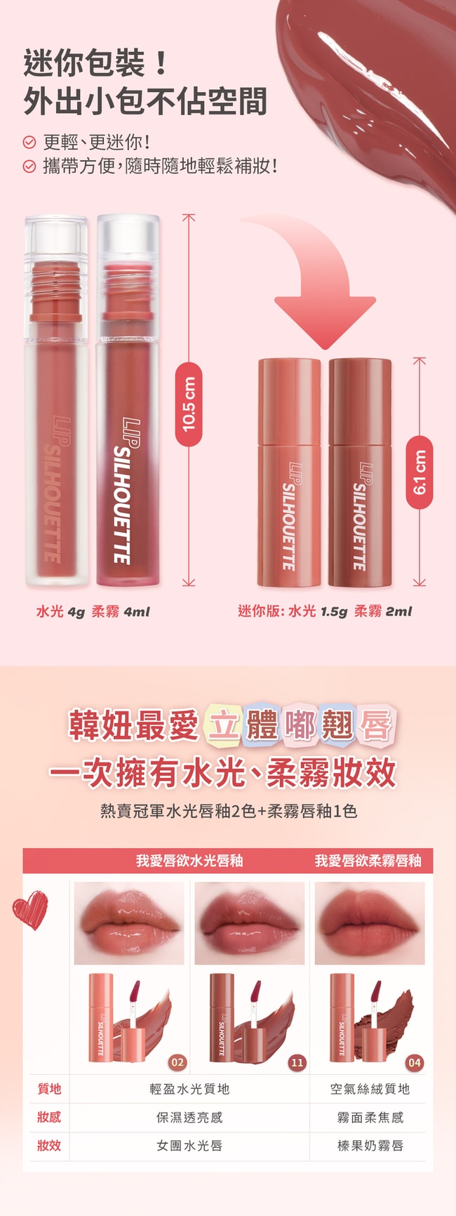 迷你組內含銷量冠軍的2支水光唇釉+1支柔霧唇釉先使用柔霧唇釉打底唇形再用水光唇釉在唇峰和下唇中間點塗輕鬆打造玻尿酸感韓系嘟翹唇!