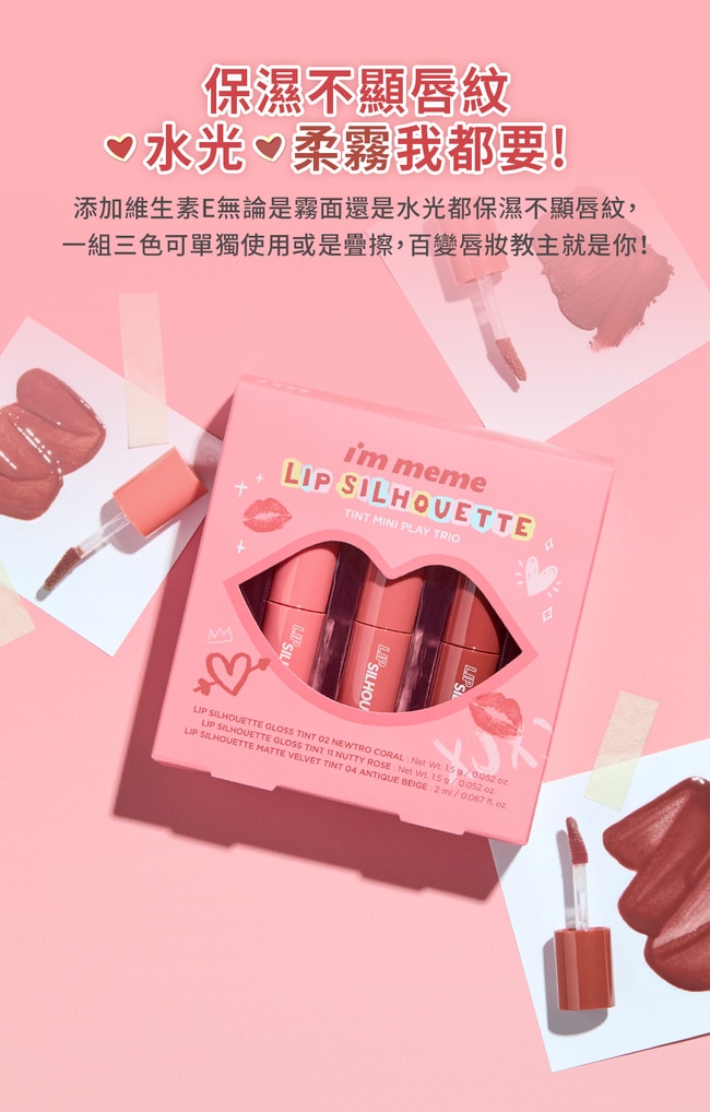 添加維生素E無論是霧面還是水光都保濕不顯唇紋一組三色可單獨使用或是疊擦百變唇妝教主就是你!