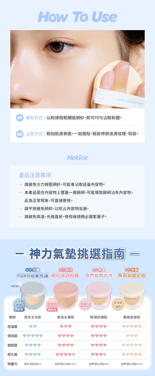 採用專櫃級網紗氣墊取粉均勻薄透上臉輕薄貼膚搭配SPF40 PA++超高防曬外出防護力滿滿補妝同時補防曬不擔心曬老、曬黑!