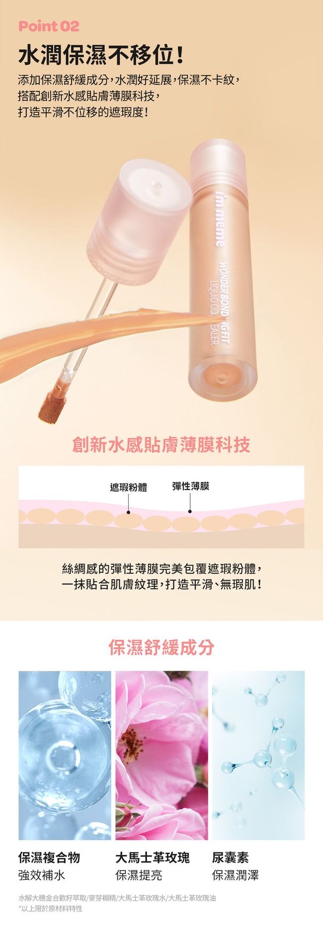 成分添加大馬士革玫瑰、紫草、非洲金合歡植萃等保濕舒緩成分水潤好延展擦上的瞬間保濕不卡紋搭配創新水感貼膚薄膜科技完整包覆粉體打造持久不位移的遮瑕度!