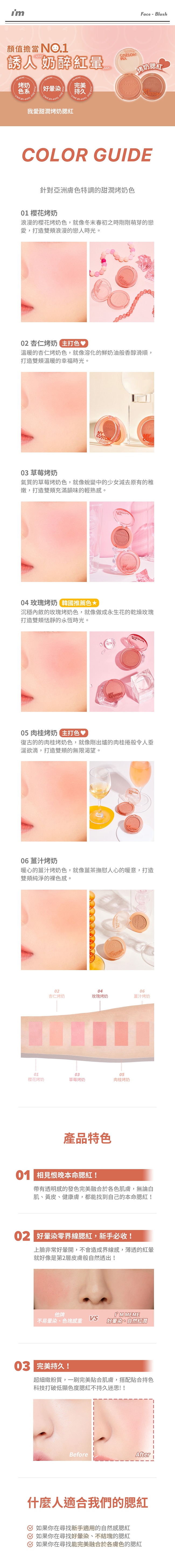 | 商品簡述 | 1.甜潤烤奶色系本命腮紅 2.好暈染零界線腮紅3.超可愛透明感刻字腮紅 |