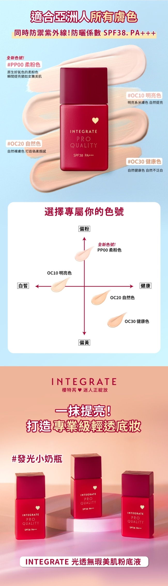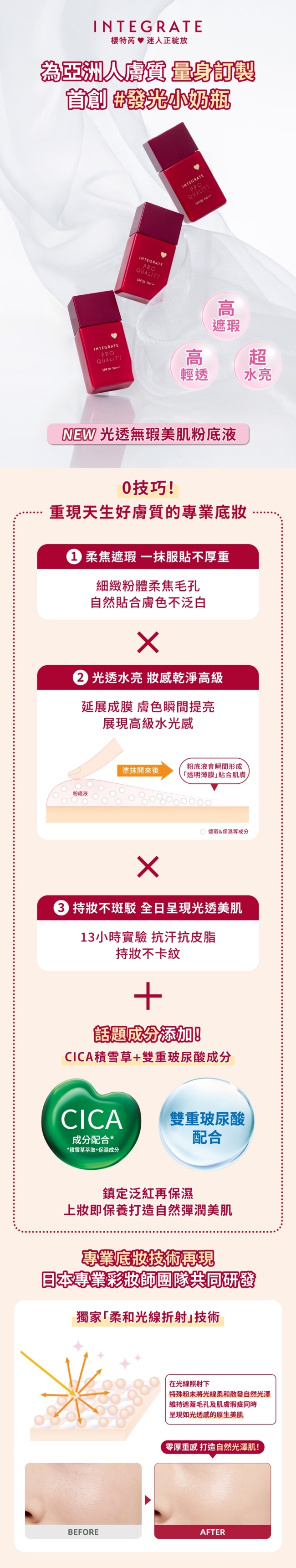 INTEGRATE 光透無瑕美肌粉底液 是一款來自日本的專業級液態粉底結合 專業化妝技術再現配方輕鬆打造自然無瑕的完美底妝。上臉後質地延展性佳用手指即可均勻塗抹絲滑貼合肌膚表面有效遮蓋毛孔、膚色不均及小瑕疵同時不會造成厚重感或浮粉現象。粉底液含有雙重保濕成分如 CICA 植萃與雙重玻尿酸提供全天候水潤光感讓肌膚看起來柔嫩光澤。防曬係數達 SPF30 PA+++在日常防護紫外線的同時保持持久妝效約 13 小時不脫妝依據品牌資料因人而異。配方設計兼顧遮瑕與透明感適合打造自然日常妝容及專業級妝感是追求 輕透水感、自然遮瑕與長效持妝 的理想選擇。