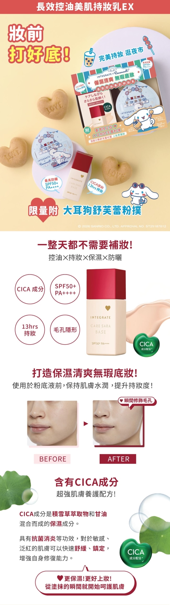 IE持妝乳三麗鷗聯名粉撲組,結合INTEGRATE高效持妝科技與三麗鷗人氣角色設計,讓底妝從妝前開始就充滿儀式感與趣味。持妝乳質地清爽輕盈,能有效修飾毛孔、平滑肌膚紋理,同時幫助後續底妝更服貼持久,不易脫妝或暗沉。特別適合台灣悶熱潮濕氣候使用,可維持長時間清爽不黏膩的妝感,打造自然透亮的底妝效果。搭配限定三麗鷗聯名粉撲,觸感柔軟細緻,能幫助底妝更均勻服貼,提升整體妝容精緻度。無論是日常通勤、外出約會或長時間活動,都能輕鬆維持穩定妝感,同時透過可愛聯名設計增添使用樂趣與收藏價值,是兼具機能與話題性的限定組合。