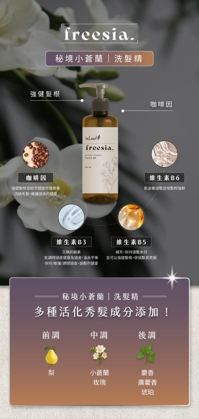 秘境小蒼蘭-- 強健髮根洗髮精咖啡因、維生素B3、維生素B5、維生素B6