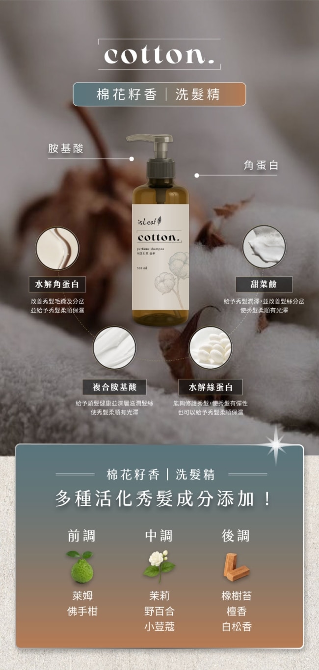 棉花籽香-- 胺基酸洗髮精水解角蛋白、複合胺基酸、甜菜鹼、水解絲蛋白