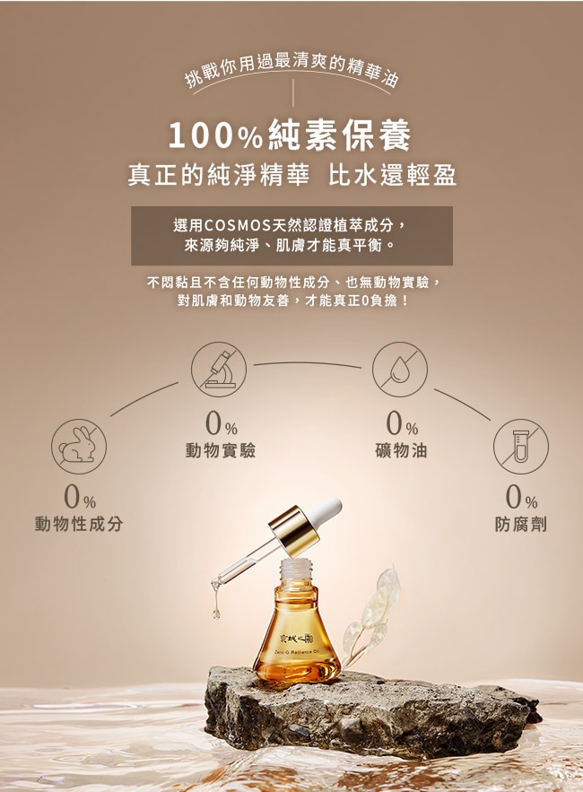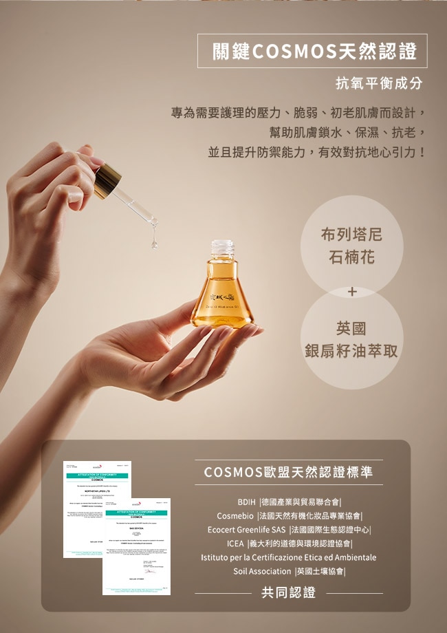 想要完美膚質剛剛好的油水平衡很重要不論乾肌、混合肌、油性肌、敏弱肌都需要的油真正100%純素保養0動物性成分、0動物實驗、 0礦物油、0防腐劑比水還輕盈的零重力平衡精華油選用COSMOS天然認證的抗氧平衡成分布列塔尼石楠花+英國銀扇籽油萃取專為需要護理的壓力、脆弱、初老肌膚而設計幫助肌膚鎖水、保濕、抗老並且提升防禦能力有效對抗地心引力