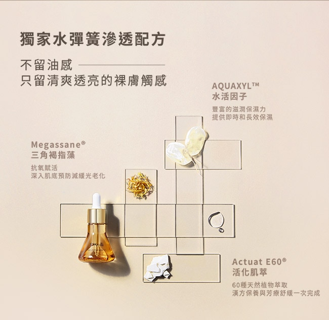 | 商品簡述 | 獨家水彈簧滲透配方不留油感只留清爽透亮的裸膚觸感 長效保濕 ; 抗氧賦活深入肌底預防減緩光老化 |