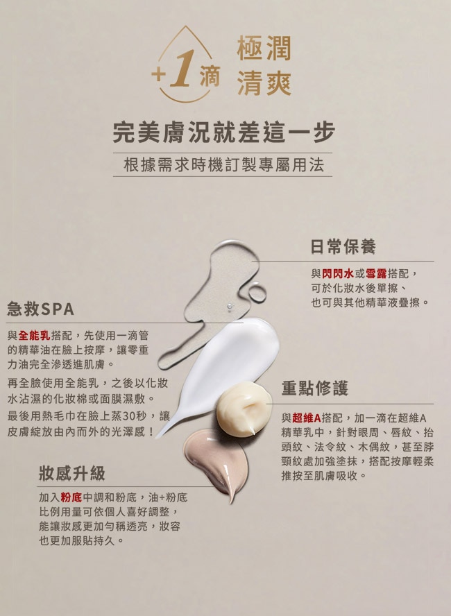 加1滴保養升級美肌plus。(加乳液 潤感升級加化妝水 油水平衡加粉底 底妝超服貼加指緣/雙唇/膝蓋等局部加強重點修護)
