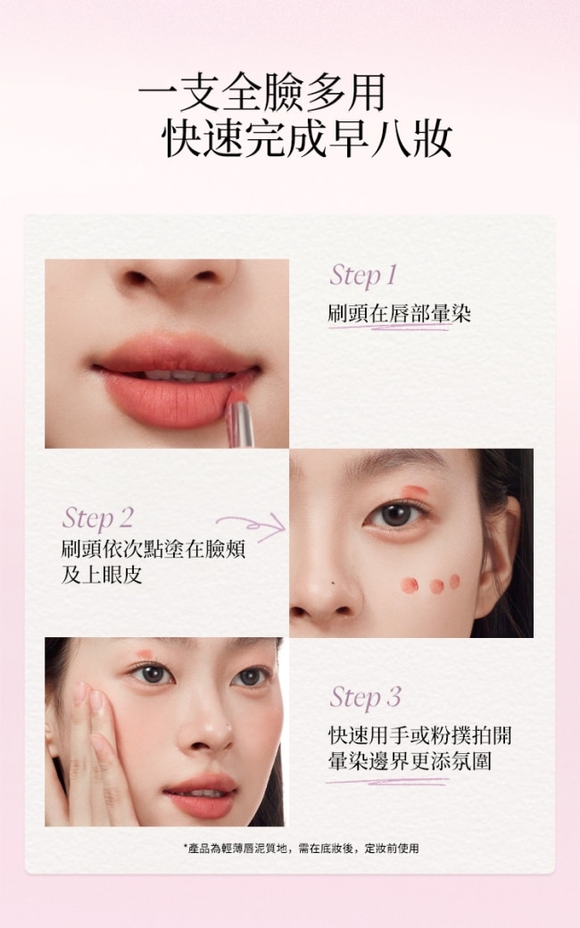 | 用法 | 使用刷頭將膏體輕刷於唇部、雙頰或眼部區域。 |