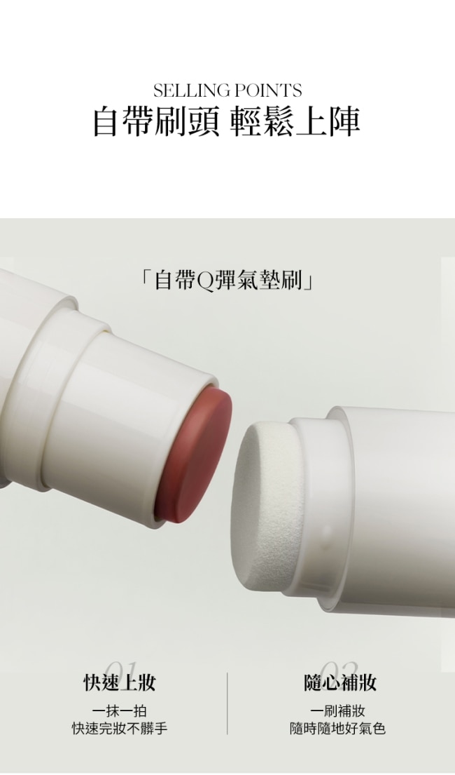 | 商品特色 | 一筆輕觸自帶Q彈氣墊刷,取粉暈染不髒手。 膚感清新釉感質地,打造柔和清新妝容。 持妝持久上妝後形成柔軟薄膜,避免腮紅脫妝。 |
