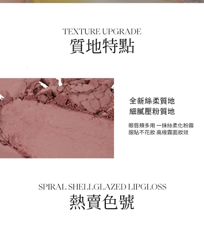 | 商品特色 | 眼唇頰多用,一抹絲柔化粉霧 服貼不花妝,高級霧面妝效 |