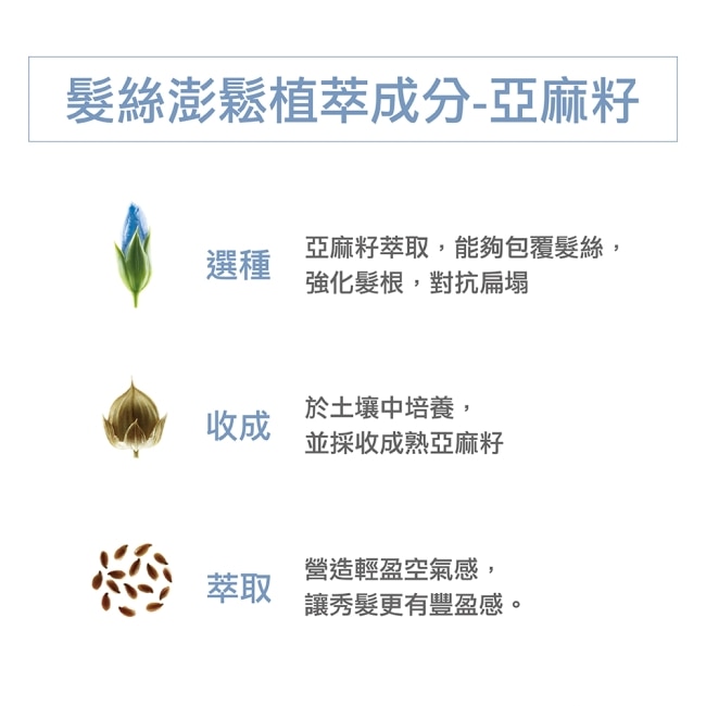 | 商品簡述 | 亞麻籽萃取能夠包覆髮絲強化髮根對抗扁塌營造輕盈空氣感讓秀髮更有豐盈感。 |