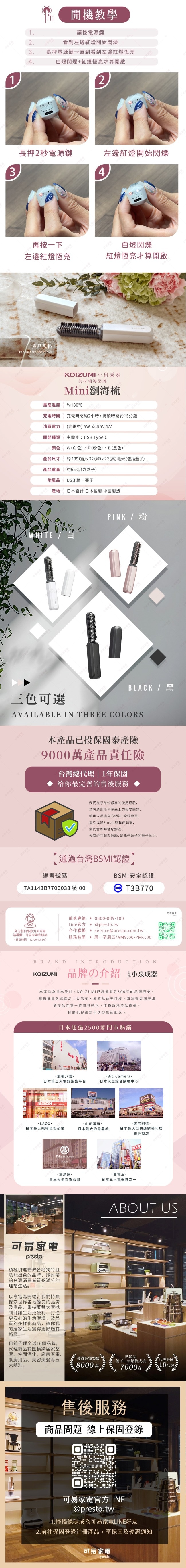 免費延長保固凡購買日本KOIZUMI小泉成器mini瀏海梳產品(BSMI認證字號: T3B770)至可易家電官方線上保固登錄完成後即可再享免費延長半年保固。