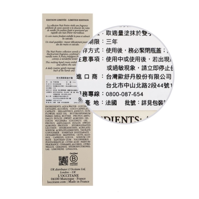 中文品名L'OCCITANE 歐舒丹 夜光黑醋栗護手霜(150ml)