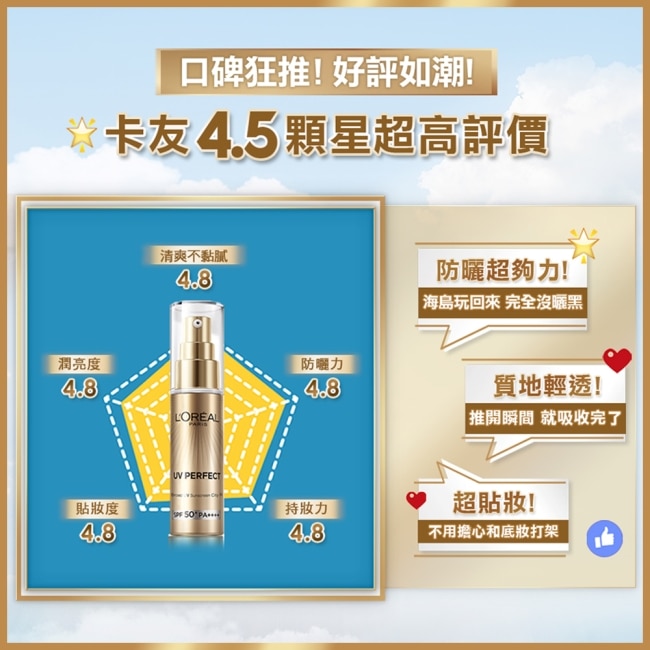 | 商品簡述 | 妝前x防曬x保養 1次完成經實驗證實98%水潤貼妝、97%更透亮、98%阻絕紫外線 |
