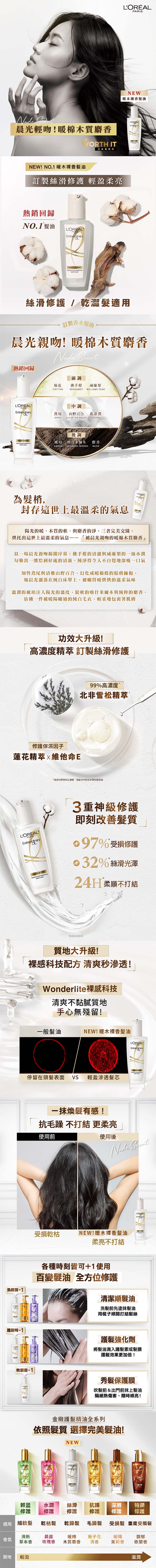 | 商品簡述 | 斷貨回歸金緻護髮精油暖木裸香 晨光輕吻暖棉木質麝香輕盈柔亮、好吸收、更清爽 |