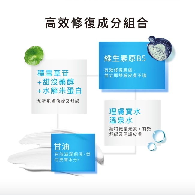添加高效修復成分維生素原B5及積雪草苷,有助立即舒緩皮膚不適,促進皮膚修復過程及提升修復品質,進一步改善肌膚局部暗沉問題。另添加溫泉水及甘油,有效舒緩並長效滋潤保濕,維持皮膚水潤。