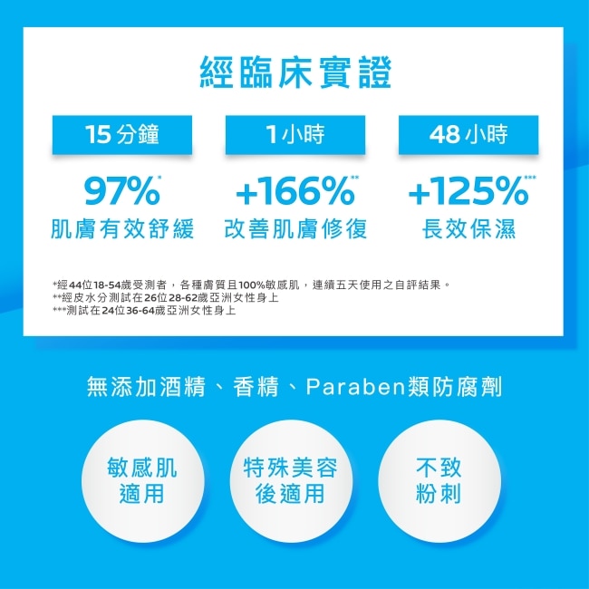 通過40位亞洲敏感性肌膚臨床測試,有效修復,不生粉刺,成分溫和安全。