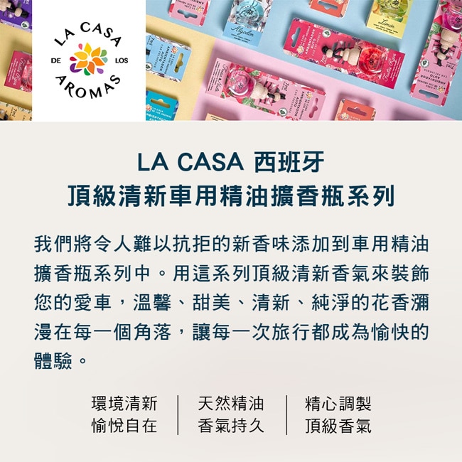 LA CASA 將令人難以抗拒的新香味添加到車用精油擴香瓶系列中。用這系列頂級清新香氣來裝飾您的愛車溫馨、甜美、清新、純淨的花香瀰漫在每一個角落讓每一次旅行都成為愉快的體驗。