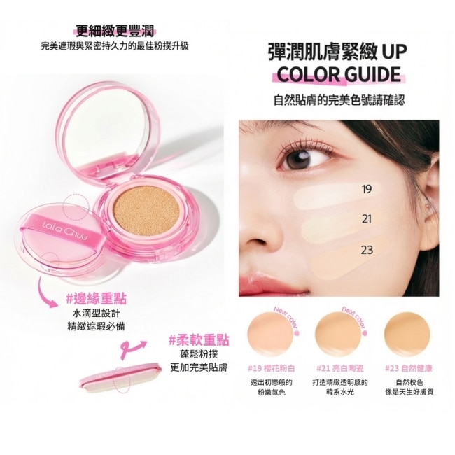 在色號選擇上也非常直覺。如果你追求的是像初戀般白裡透紅的氣色可以選擇十九號櫻花粉白。如果你喜歡韓劇女主角那種充滿透明感的水光底妝二十一號亮白陶瓷會是你的首選。而如果你希望底妝看起來非常自然、就像天生皮膚就這麼好那麼二十三號自然健康色絕對不會出錯。選對顏色再加上這款氣墊的保養成分輕鬆就能拍出讓人羨慕的緊緻水潤妝感。