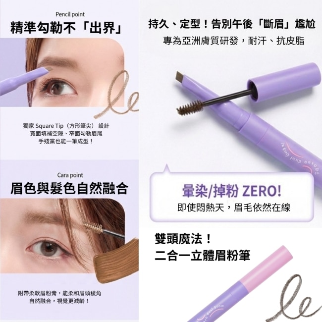 針對亞洲悶熱的氣候這款眉粉筆特別強化了耐汗與抗皮脂的能力。其專為亞洲膚質研發的配方能有效達到持久、定型並且做到零暈染、不掉粉。即使在外面奔波一整天或是午休過後也不必擔心出現斷眉的尷尬困擾讓你的眉毛從早到晚都維持在最佳狀態。