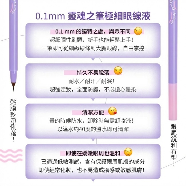 | 商品簡述 | 0.1mm極細刷頭滑順、防水防暈且持久。添加植萃護膚成分溫和低敏輕鬆卸除。完美勾勒精緻利落眼神 |