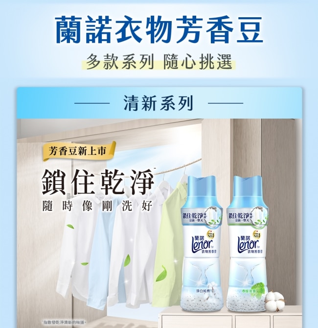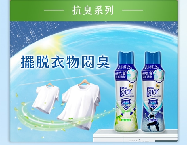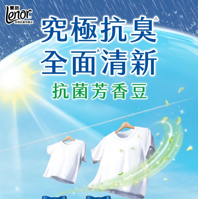 Lenor蘭諾衣物抗菌芳香豆除了在洗後持續抗菌72小時還能讓衣物持久散發日曬後的清新氣味搭配抗菌洗衣精更安心。