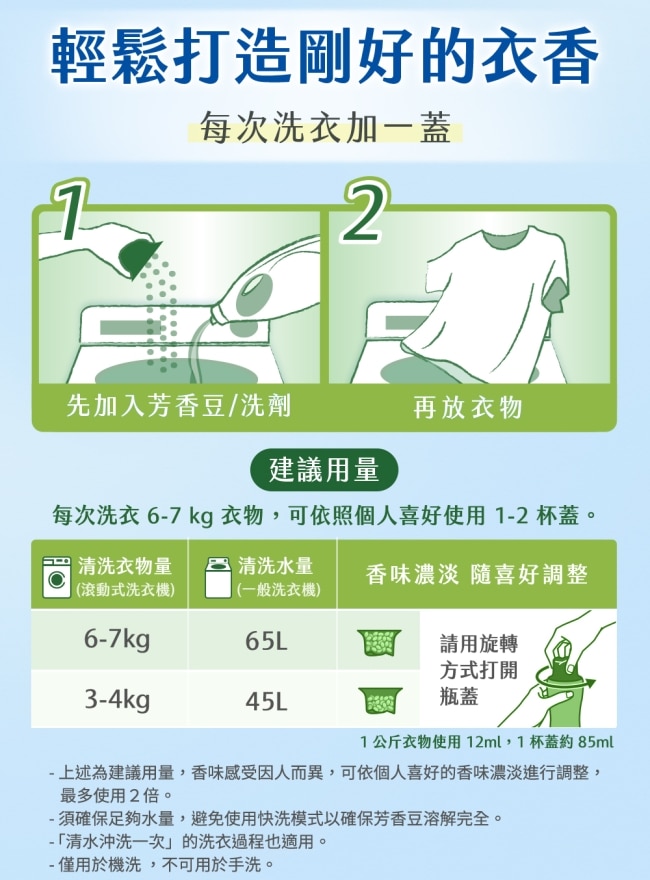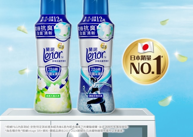 *根據Intage SRI+資料蘭諾品牌在2019-2024期間在日本織物護理市場市佔率最高。^摩擦衣物即可釋放留香因子;據P&G內部實驗室測試衣櫃儲藏情況下留香長達12週。+指配方未設計添加漂白劑、柔軟精適用於各種衣物。**指衣物芳香豆設計具備易溶於水的特性確保洗衣水量充足無過多衣物、不超過2蓋用量正確使用不會因芳香豆溶解不完全造成殘留。-根據P&G測試使用本品室內晾曬與未使用本品室外晾曬的對比~根據第三方實驗資料針對特定菌種測試。並非抑制所有細菌滋生。***並非去除現有霉菌與髒污