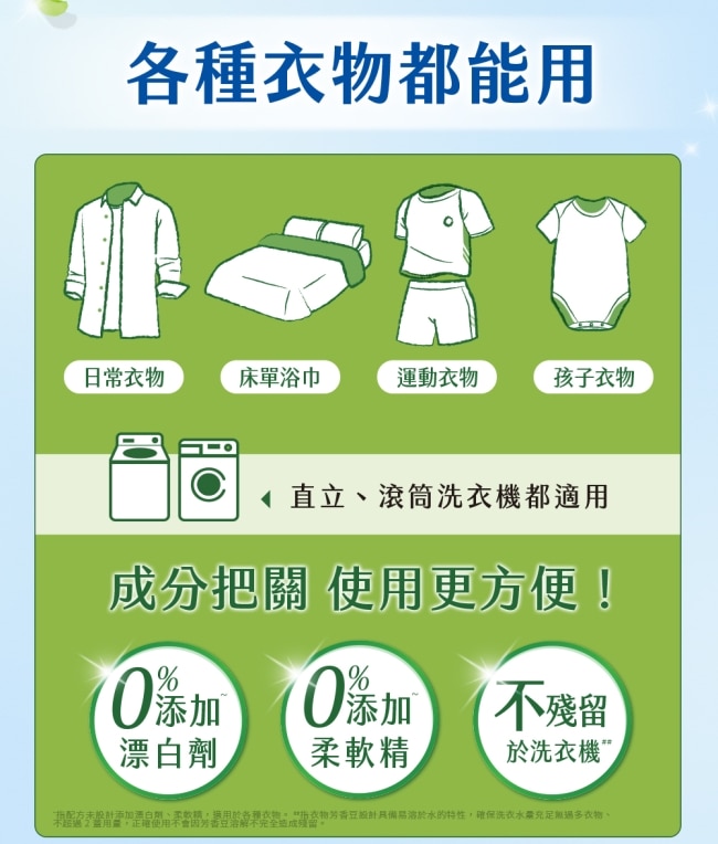 成本把關0+添加漂白劑、柔軟精不殘留於洗衣機** 直立/滾筒洗衣機都沒問題