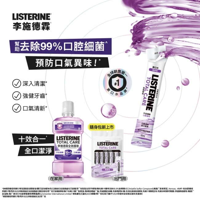 LISTERINE®漱口水隨身包,讓你隨時享有與LISTERINE®瓶裝漱口水相同的清新口氣與全口清潔體驗。