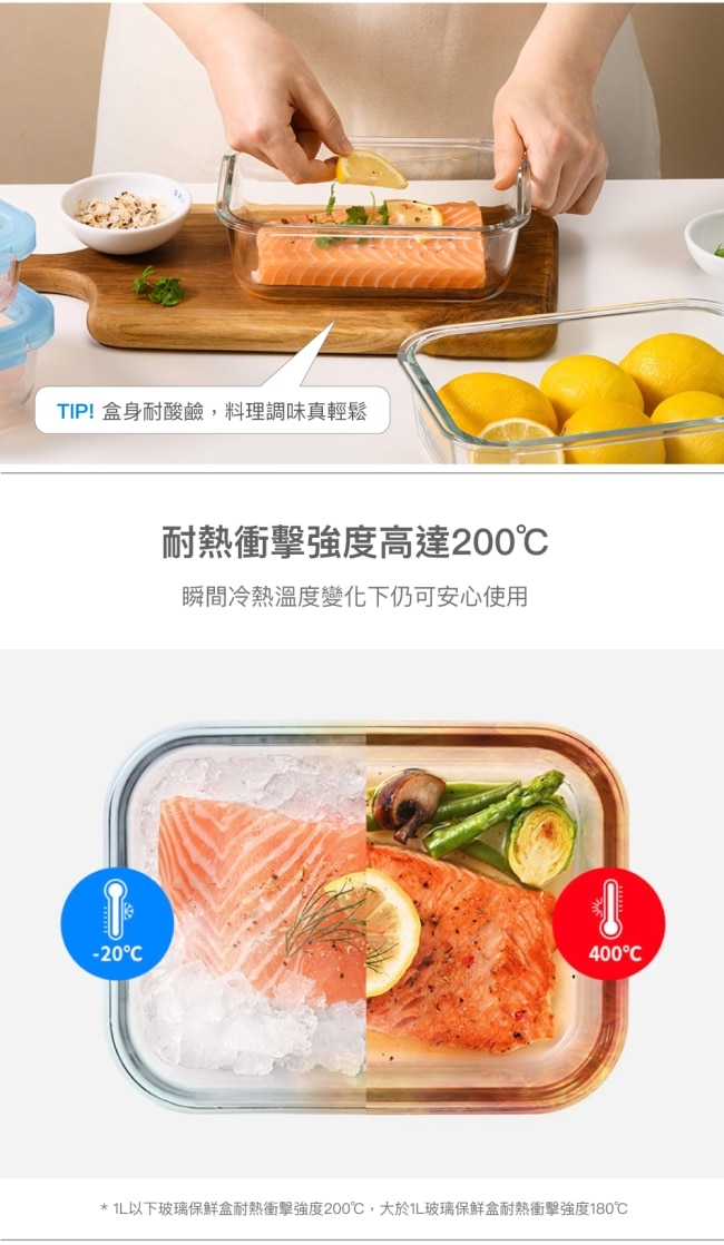 盒身採用最安全的硼矽酸耐熱玻璃冷凍(攝氏-20度)到烤箱、氣炸鍋(攝氏400度)都適用美味輕鬆上桌