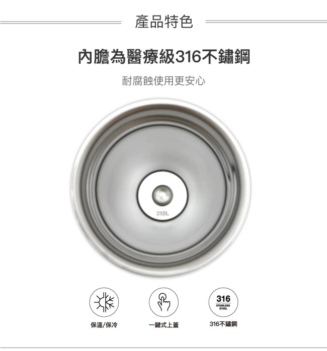 內膽為醫療級316不鏽鋼耐腐蝕使用更安心