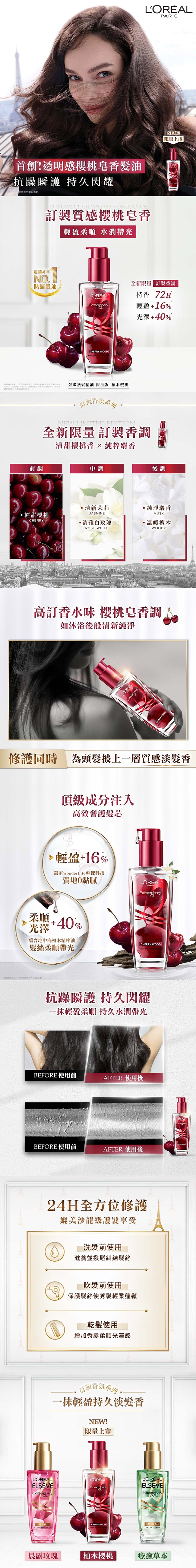 | 商品簡述 | 透明感櫻桃皂香髮油 抗躁瞬護 持久閃耀 |
