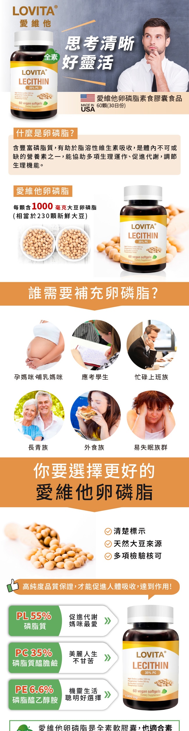 | 商品簡述 | 市售唯一全素卵磷脂軟膠 嚴選非基因改造大豆 美國原料大廠SOLEC卵磷脂 高含量磷脂醯膽鹼(PC) |