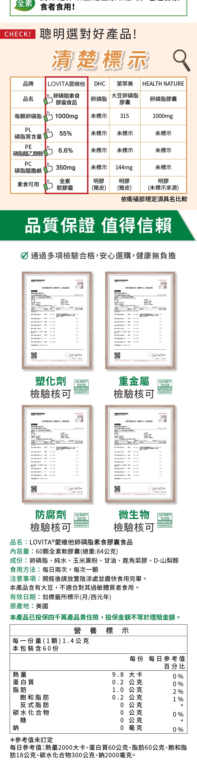商品品名LOVITA愛維他 大豆卵磷脂素食軟膠囊