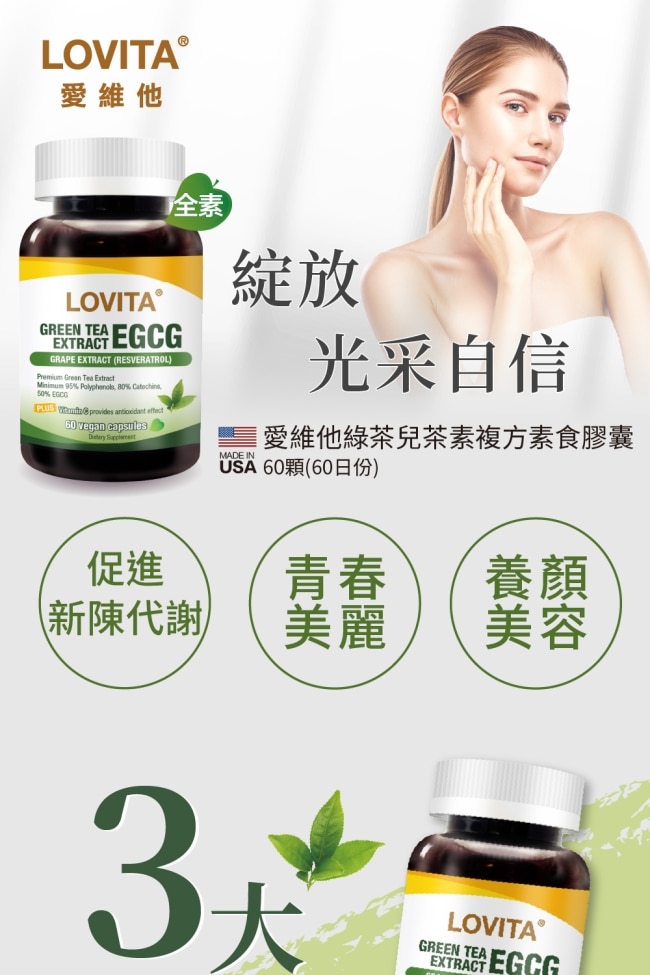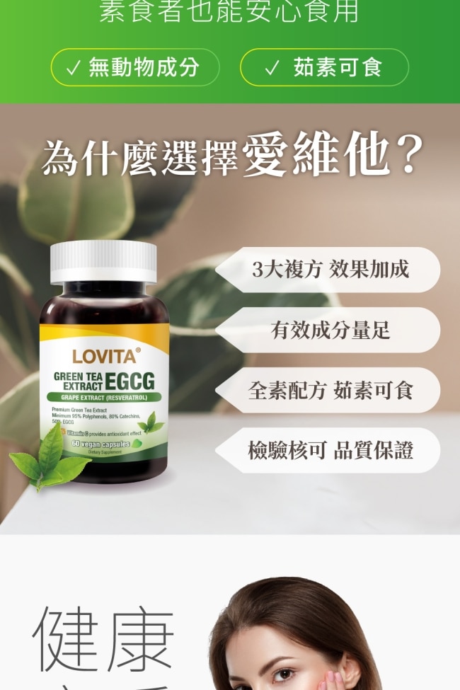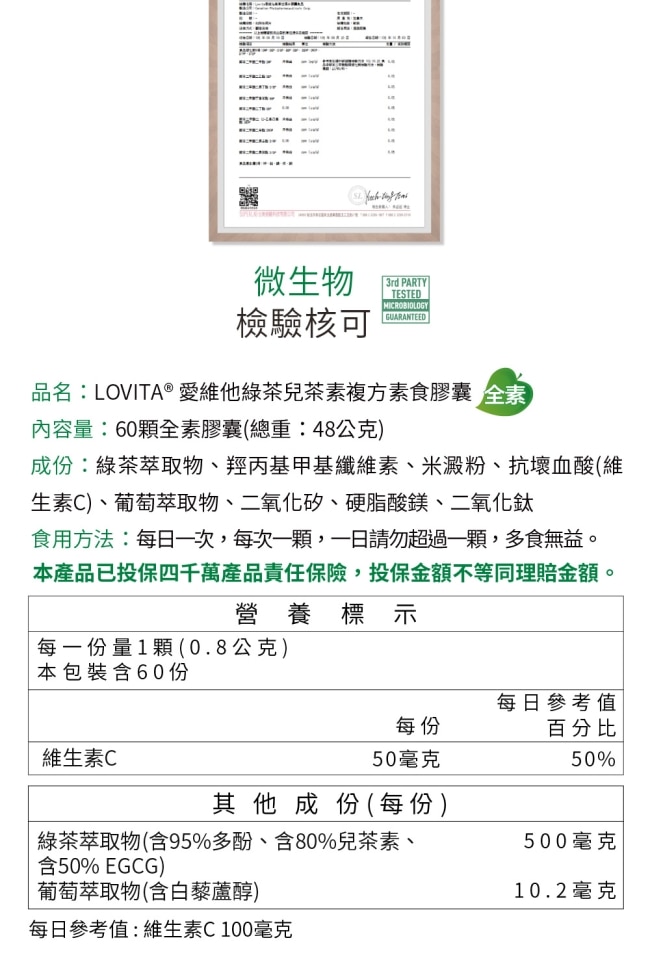 2.商品品名Lovita愛維他綠茶兒茶素EGCG白藜蘆醇素食膠囊 60顆(兒茶素 綠茶多酚)