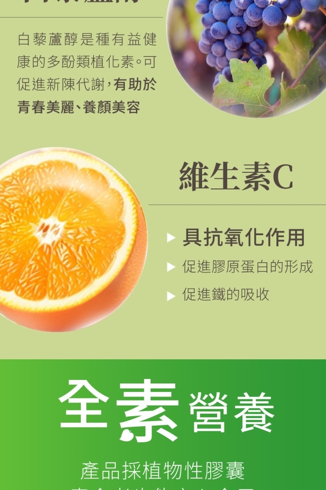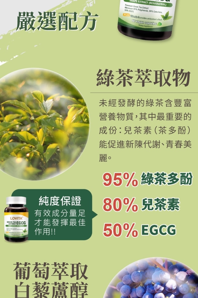 | 商品簡述 | 高效萃取綠茶EGCG 維持青春必備葡萄來源白藜蘆醇 添加抗氧化作用維生素C 吸收率UP |