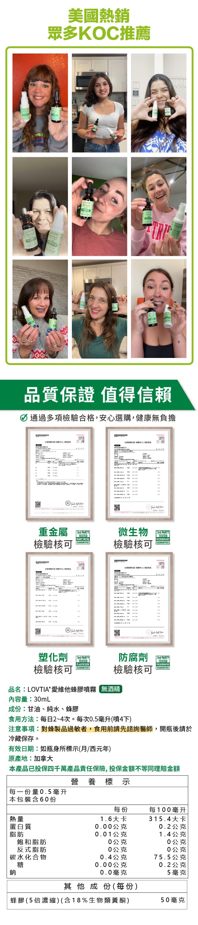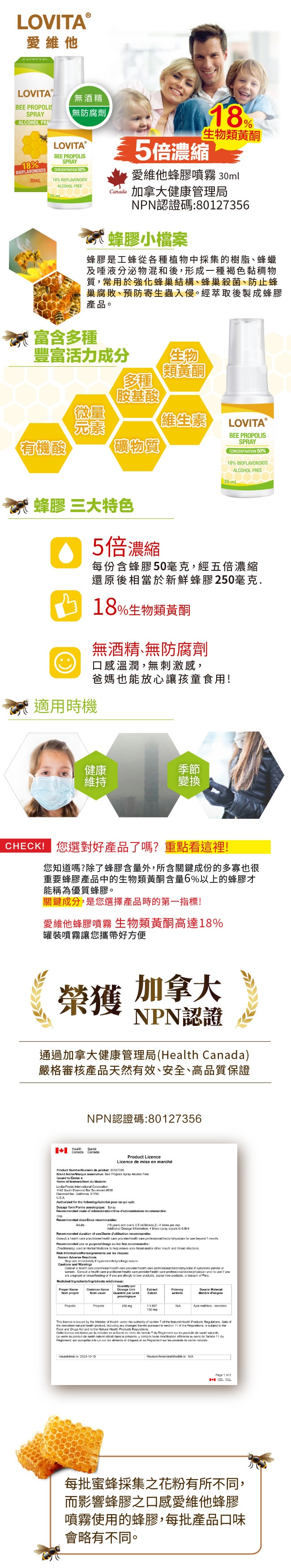 品名Lovita愛維他 加拿大蜂膠噴霧 18%生物類黃酮 (無酒精 噴劑)