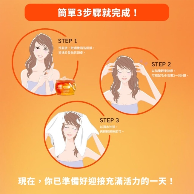 洗髮後將多餘水分輕擰乾取適量護髮霜均勻塗抹於髮中段至髮尾。