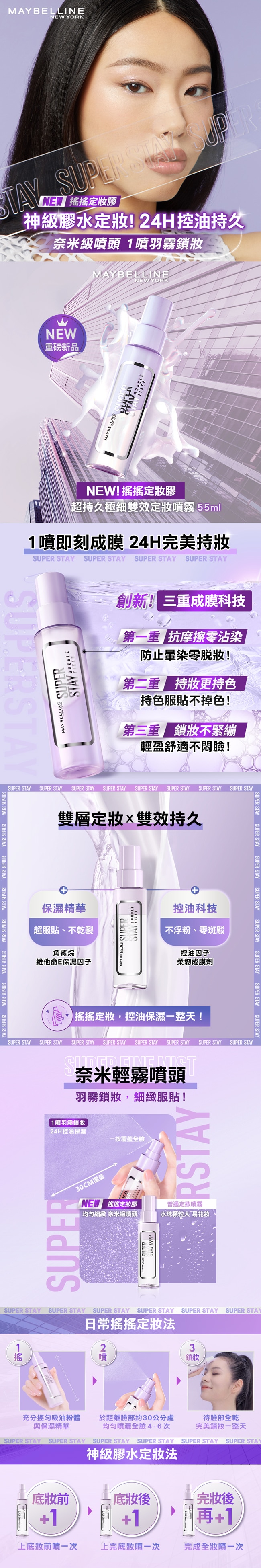 | 商品簡述 | 雙層定妝 X 雙效持久 神級膠水定妝24H控油持久 奈米級噴頭 1噴羽霧鎖妝 |