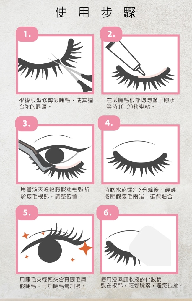 6如何卸除請使用浸濕卸妝液的化妝棉敷在睫毛根部可在避免眼皮拉扯的情況下輕鬆卸除。