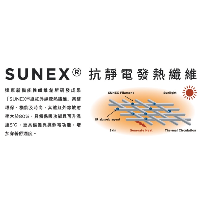 遠東新機能性纖維SUNEX®遠紅外線發熱纖維具備保暖功能且可升溫達5°C更具備優異抗靜電功能增加穿著舒適度。