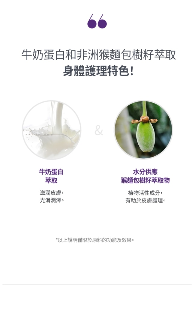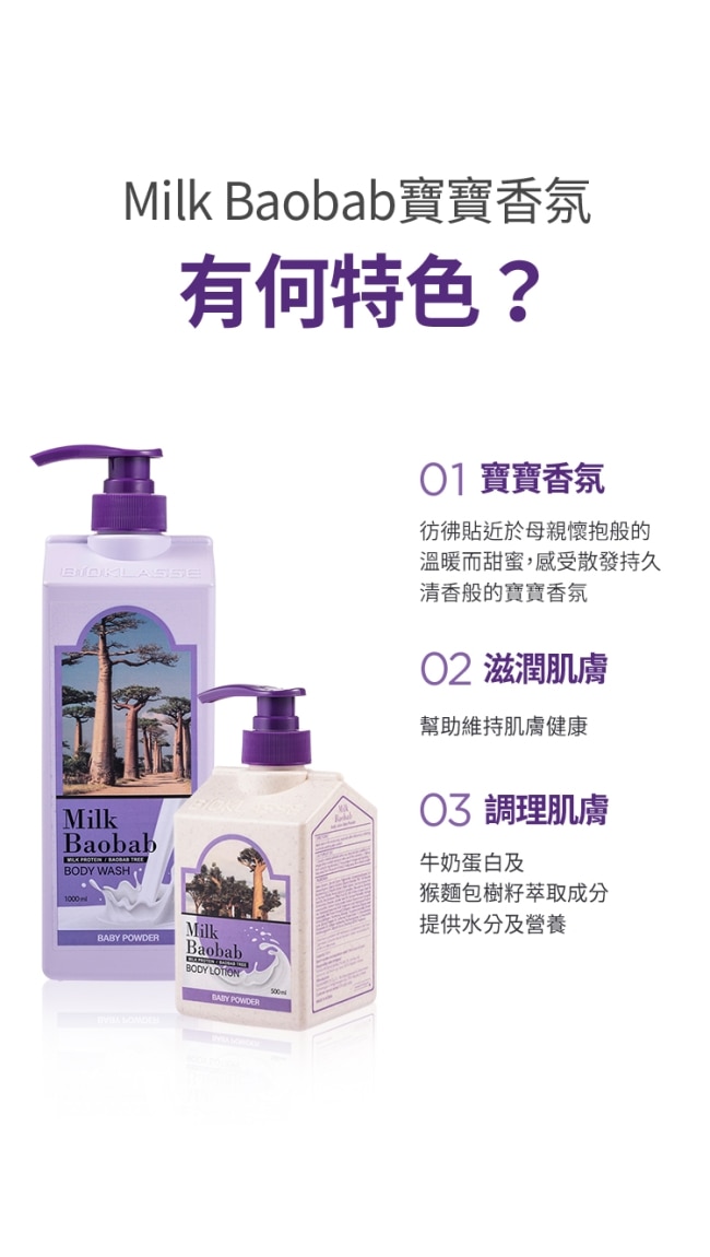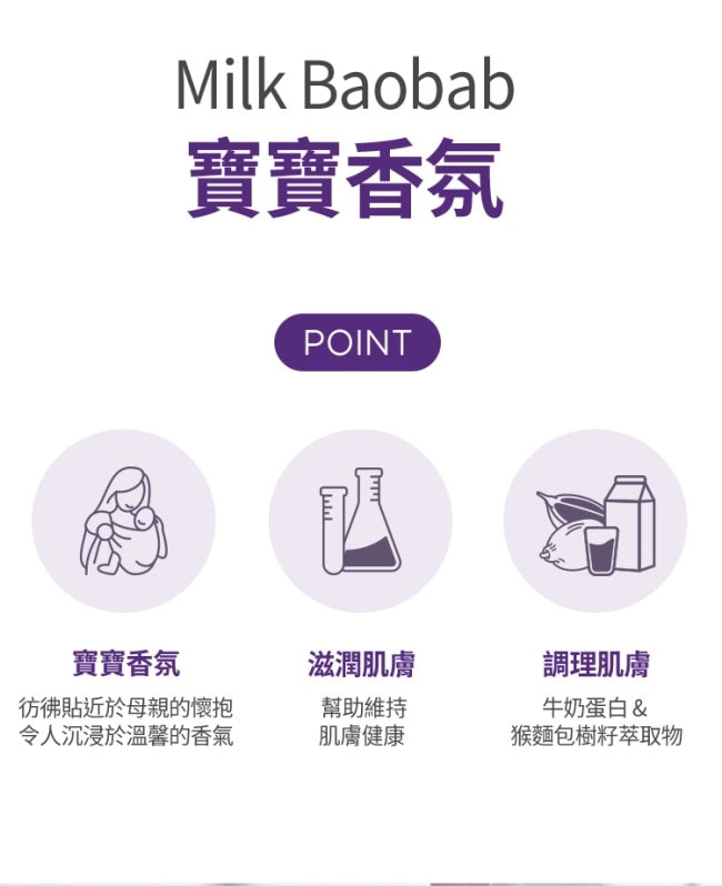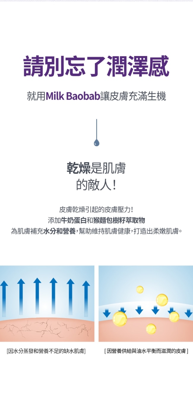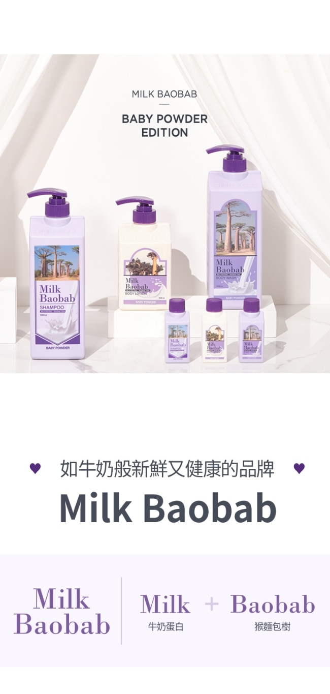 Milk牛奶蛋白與Baobab猴面包樹籽的結合Milk Baobab所有產品含有該成分給您帶來大自然的滋養