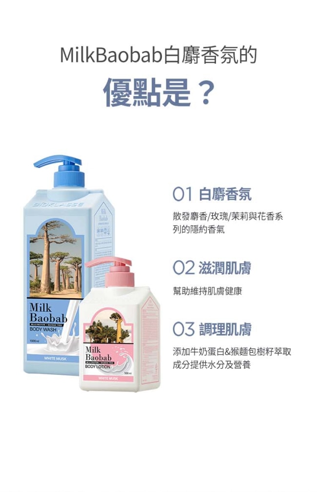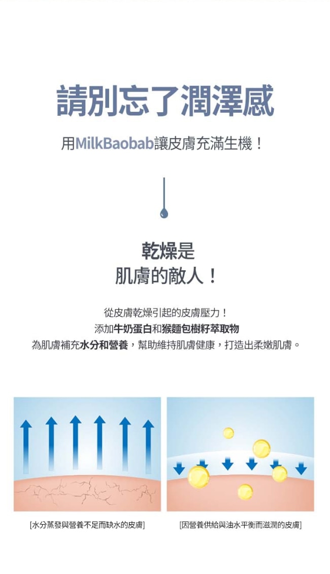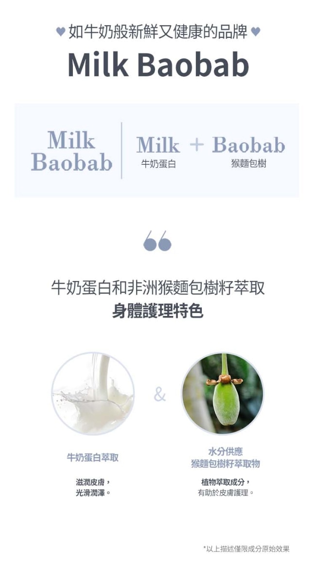 Milk牛奶蛋白與Baobab猴面包樹籽 的結合Milk Baobab所有產品含有該成分給您帶來大自然的滋養