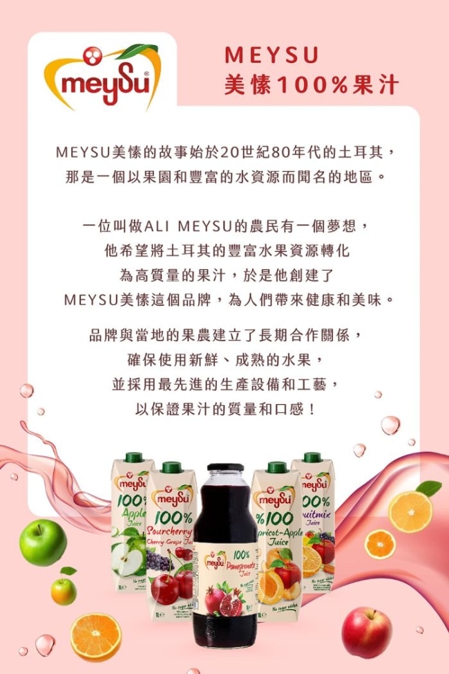 一位叫做Ali Meysu的農民有一個夢想他希望將土耳其的豐富水果資源轉化為高質量的果汁於是他創建了MEYSU 這個品牌以實現他的願景為人們帶来健康和美味。