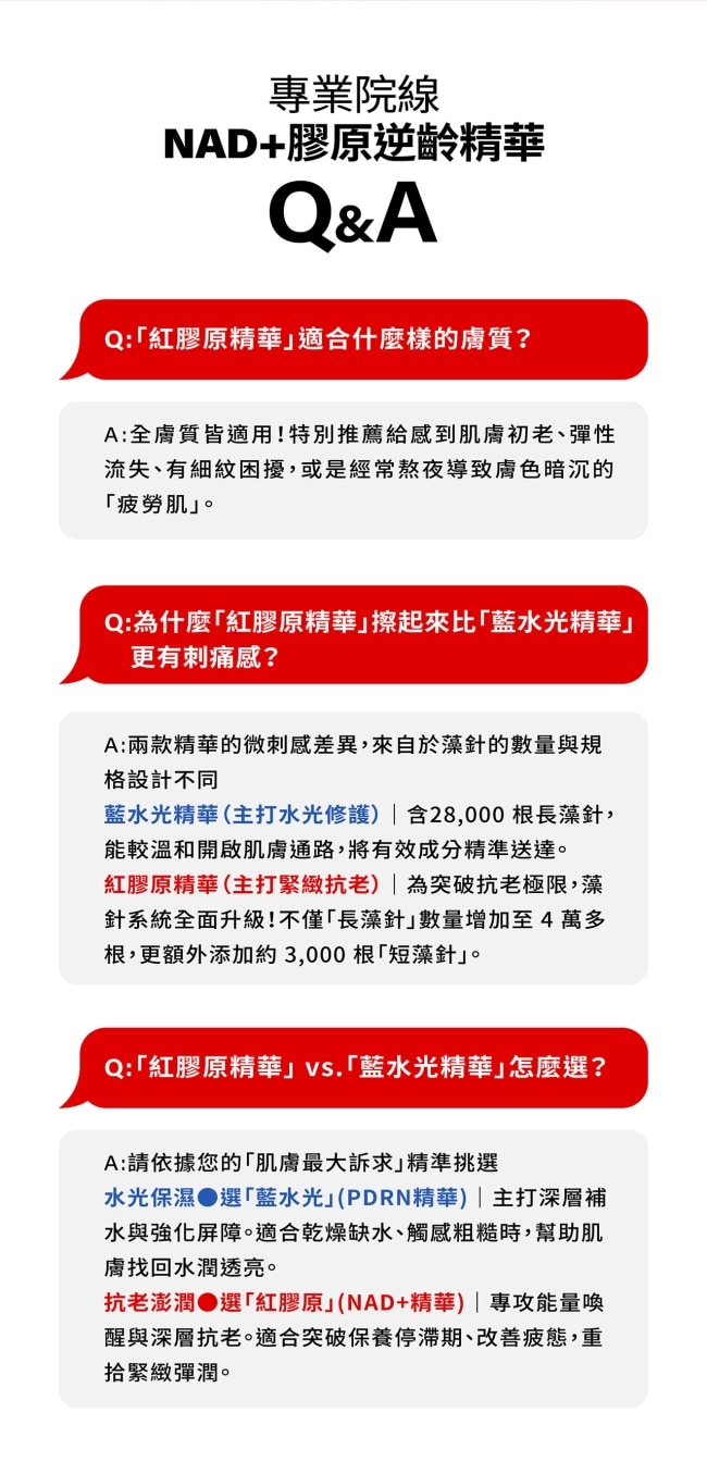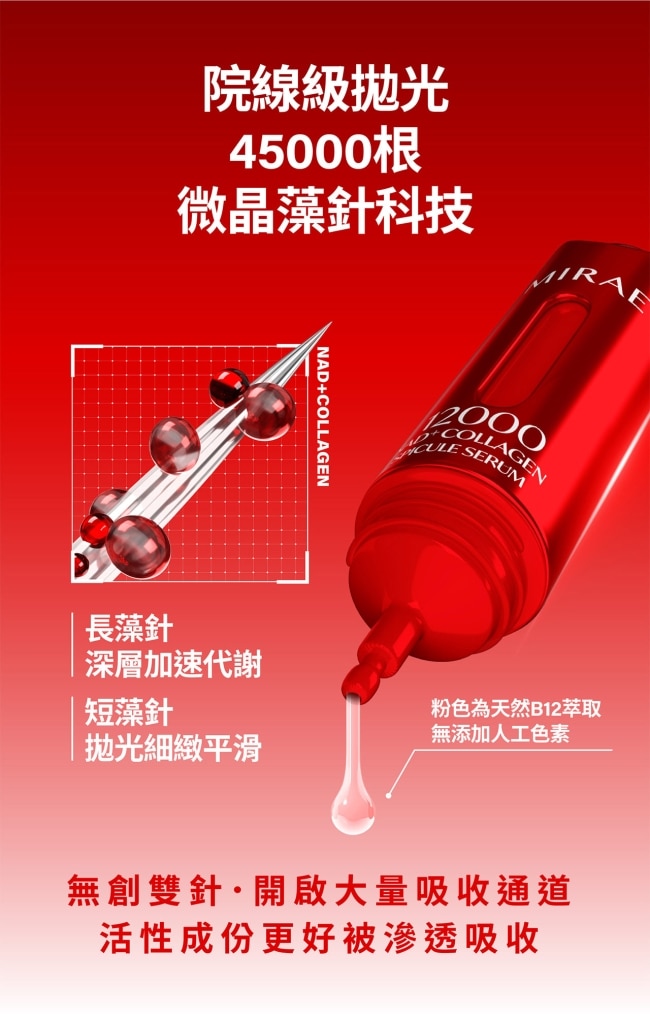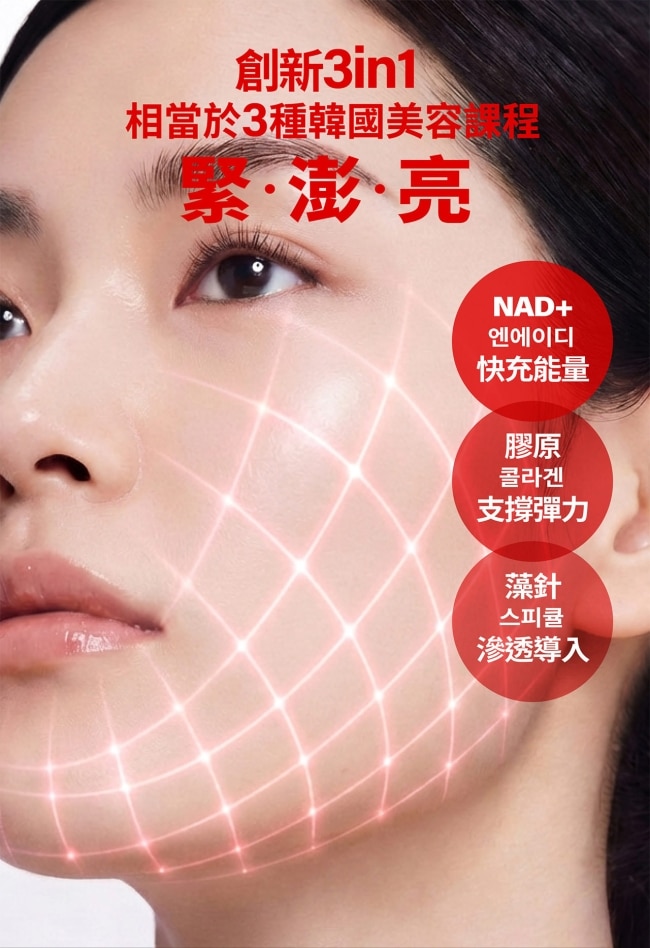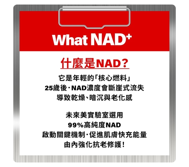 主要成分: NAD+小分子膠原胜肽、長藻針、短藻針、植物環肽A、菸鹼醯胺、水楊酸、維他命B12(全成分詳見英文標示)